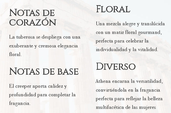 Celebra tu yo auténtico con Athena (L) Eau de Parfum, una fragancia diseñada para encarnar vitalidad y diversidad. Este aroma floral gourmand captura la alegría y elegancia de la feminidad moderna. Abriendo con una nota radiante de jazmín, florece en un corazón de rica tuberosa, mientras que la base de madreselva china aporta calidez y sofisticación. Inspirada en la esencia de la naturaleza, Athena te invita a elevar tus sentidos y a abrazar la belleza atemporal con cada pulverización.
