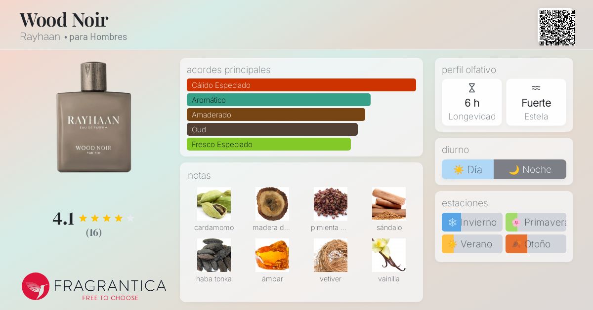 Wood Noir de Rayhaan es una fragancia de la familia olfativa Amaderada Aromática para Hombres. Wood Noir se lanzó en 2023. Las Notas de Salida son cardamomo y pimienta de Sichuan; las Notas de Corazón son madera de oud, sándalo y vetiver; las Notas de Fondo son haba tonka, ámbar y vainilla.