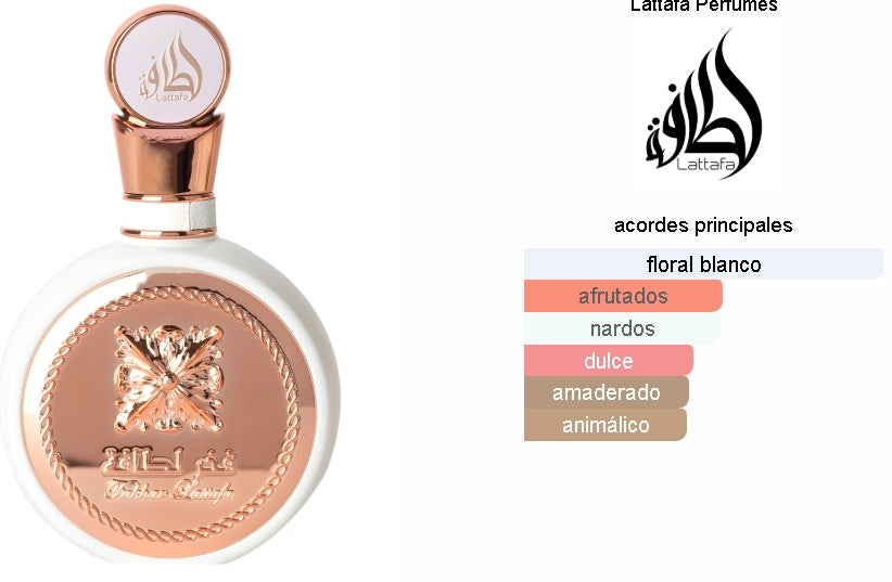 Fakhar Rose de Lattafa Perfumes es una fragancia de la familia olfativa Floral para Mujeres. Esta fragrancia es nueva. Fakhar Rose se lanzó en 2022. Las Notas de Salida son frutas, azucena, granada y aldehídos; las Notas de Corazón son nardos, jazmín, gardenia, ylang-ylang, madreselva, rosa y peonía; las Notas de Fondo son vainilla, almizcle blanco, sándalo y ambroxan.